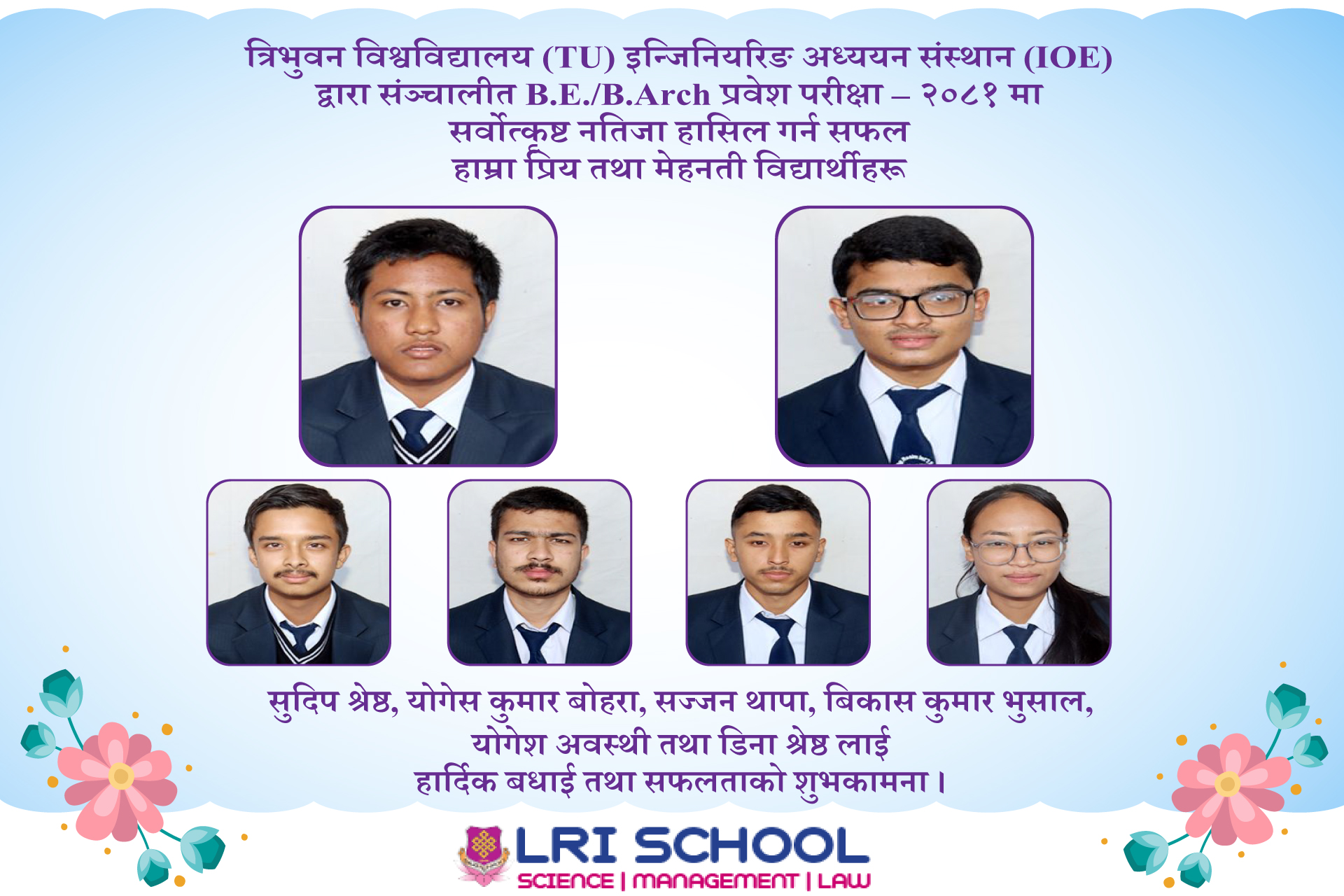Congratulations to LRI Students for achieving excellent results in B.E./B.Arch. Entrance Test 2081