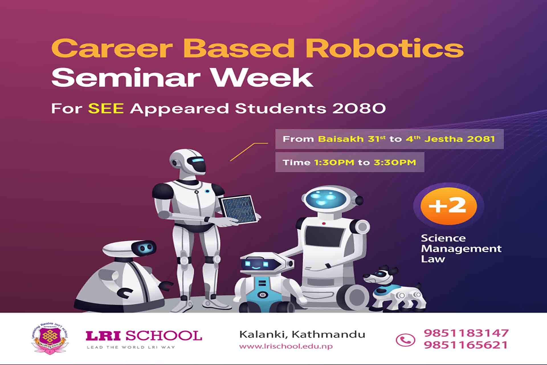 LRI School 10+2 is organizing a career based Robotics seminar week for SEE appeared students 2080, starting from Baisakh 31st to 4th Jestha 2081 at 1.30pm-3.30pm .